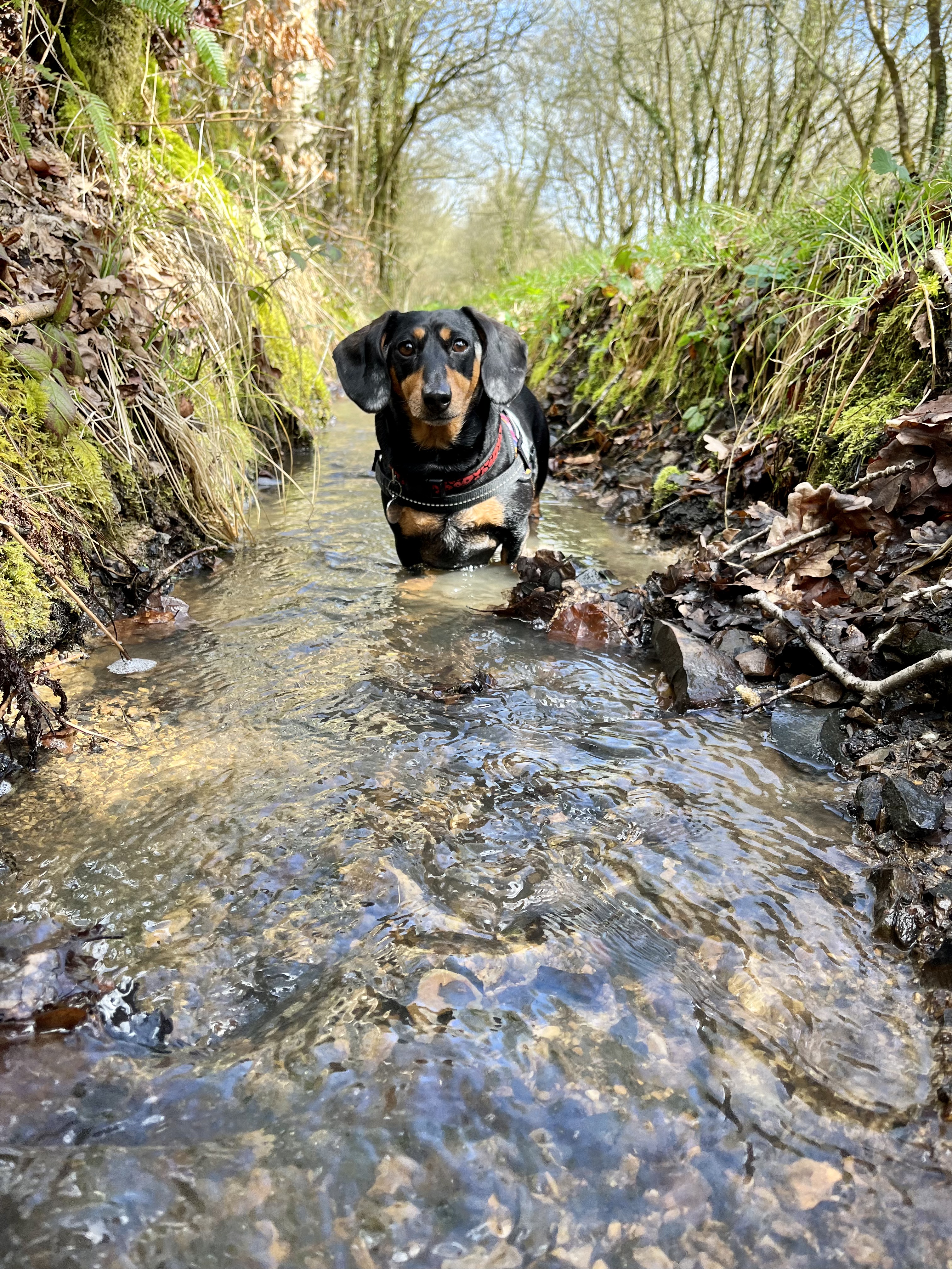 An appallingly behaved sausage dog refusing to walk along the Ruby Way, insisting instead on splashing through the storm gully along the side 🤣